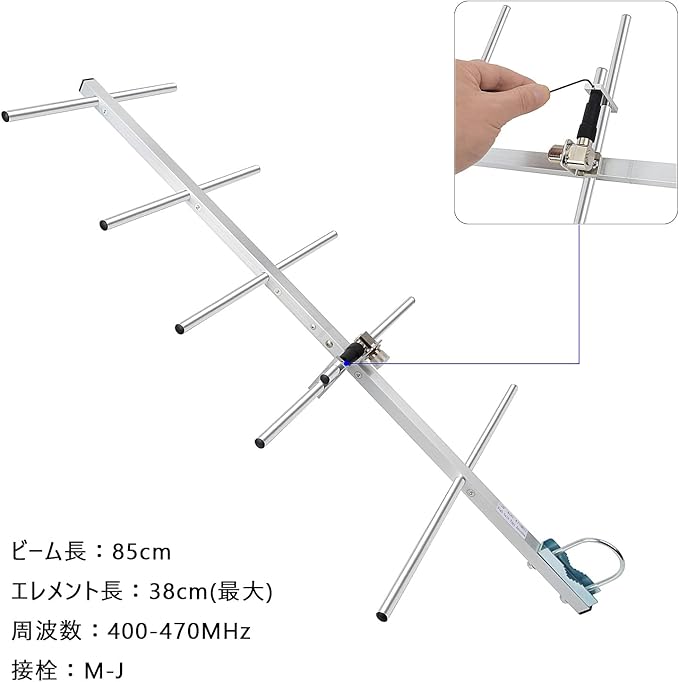 ビーム長: 85cm エレメント長:38cm(最大)重量: 0.4Kg 利得:9dBi インピーダンス:50Ω FB比:15dB以上 耐風速:60 m/s 接栓:M-J 適合マスト径: 30~ 40 mm