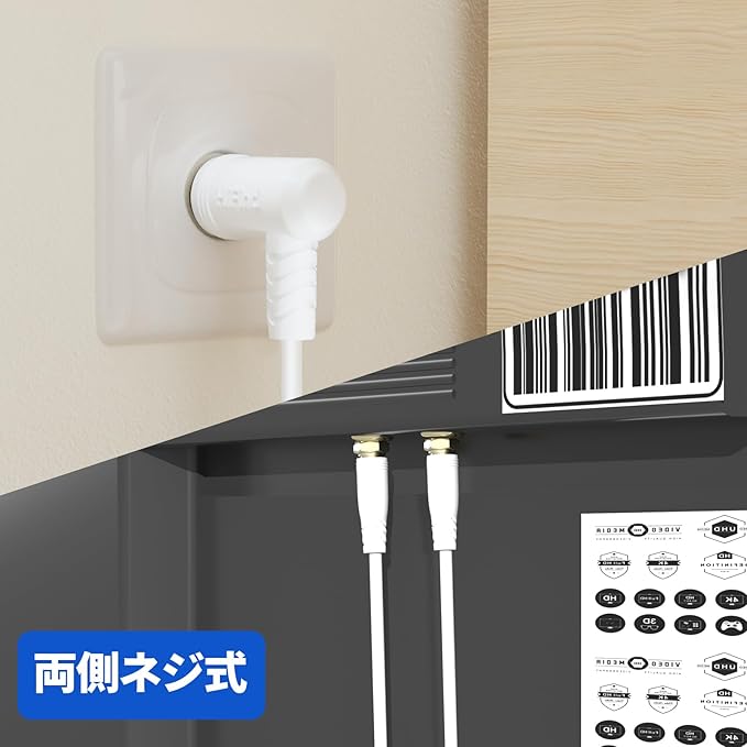 【多様性】様々な長さと選択肢をご用意しており、様々な使用シーンに対応します。必ずお客様のニーズに合ったものが見つかります。①両側F型ネジ式:ネジ式コネクターは非常にしっかりと接続できるため、特に安定性を重視する人や、抜き差しが頻繁に行われないシナリオに適しています。小さなお子様が誤って引っ張ってしまっても抜けづらく安心です。②L字ネジ式:頻繁に抜き差ししない狭い壁コンセントとテレビの接続におすすめです。③L字差込式/ネジ式:頻繁に抜けない壁コンセーントやテレビ、頻繁/早くに抜け違いしする必要がある狭い場所や密閉された環境。④両側差込式:頻繁/早くに抜け違いしする必要がある環境、またはテレビの後ろに垂直に接続します⑤L字差込式:片側は狭い壁のコンセントに接続でき、もう片側はテレビの後ろに垂直に接続できます。⑥両側L字差込式:機器の両側のスペースが限られているか狭い場合。