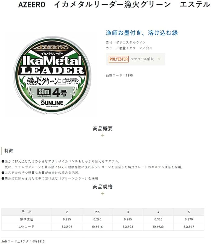 コンセプト:【イカメタルリーダー 漁火グリーン】……集魚灯(漁火)に照らされた光と同じカラーである「漁火グリーン」は光に色が馴染み周囲の環境に溶け込む!! ターゲットに警戒心を与えにくい超高感度シリコーン入りエステルライン!!