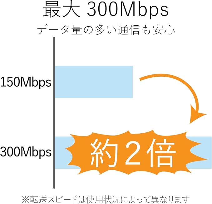IEEE802.11b/g/nに対応し、最大300Mbpsの無線通信が可能です。