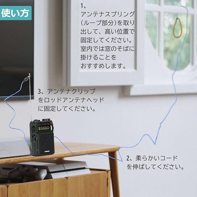 「使い方」1、アンテナスプリングを取り出して、高い位置で固定してください。室内では窓のそばに掛けることをおすすめします。2、柔らかいコードを伸ばしてください。3、アンテナクリップをロッドアンテナヘッドに固定してください。