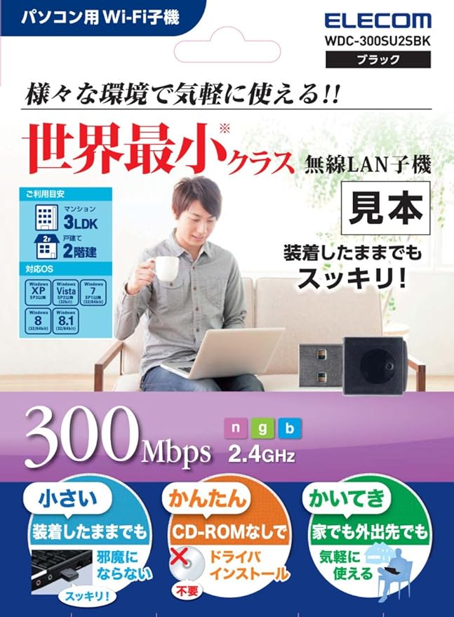 IEEE802.11b/g/nに対応し、最大300Mbpsの無線通信が可能です。業界標準の2.4GHz通信に対応し、宅内のルータはもちろんの事、Wi-Fiスポットやポケットルータなど幅広い環境で使えます。装着したまま持ち運んでも邪魔になりません。