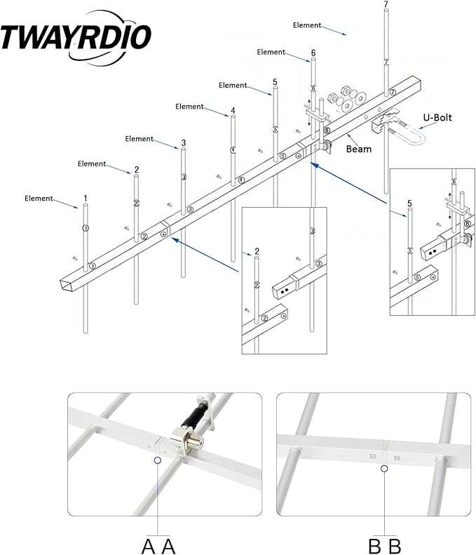 TWAYRDIO 7エレメント 八木アンテナ UHFバンド(400-470MHz) 3分割式 ハイゲイン 高利得 MJ型コネクタ U型ボルト付 トランシーバー用 無線機用 TW-YG07