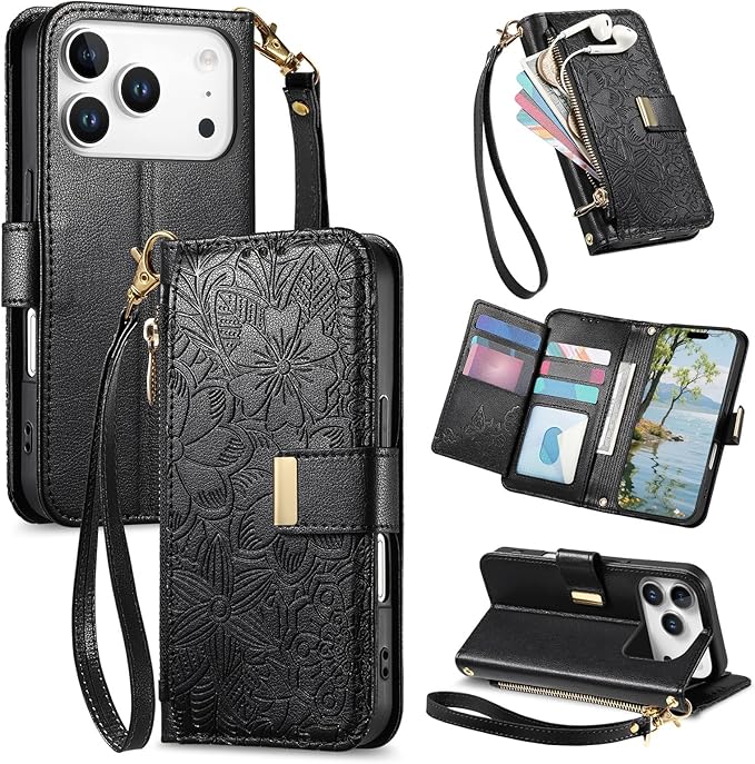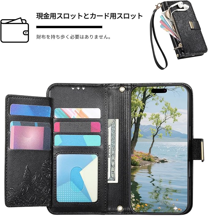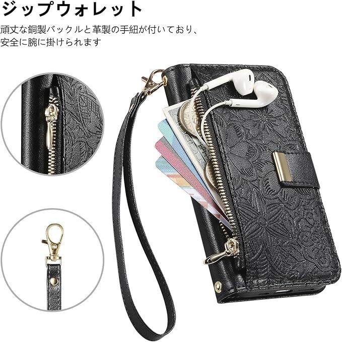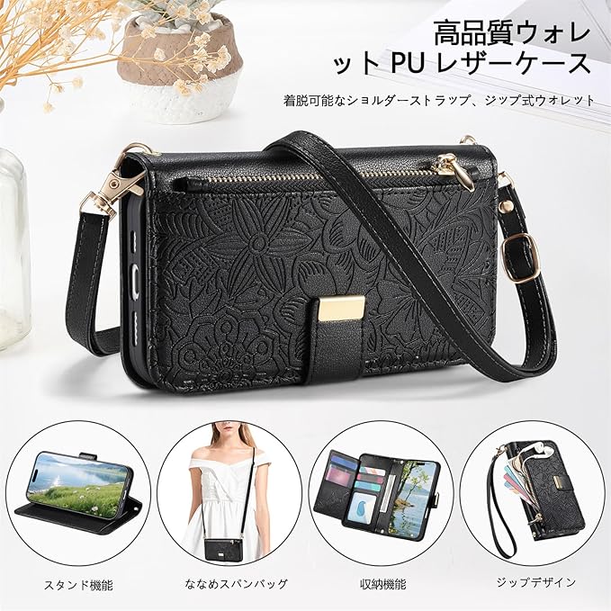 TOO&SOO 対応 いphone17promax ケース 手帳型 肩掛け iphone 17 pro max ケース ショルダー スマホケース アイホン17プロマックス 斜めがけ 人気 アイフォン17promax 携帯カバー 花柄 斜め掛け 女性 肩がけ ストラップ付き 小銭入れ カード収納 スタンド機能 シンプル お洒落 衝撃吸収 - ブラック