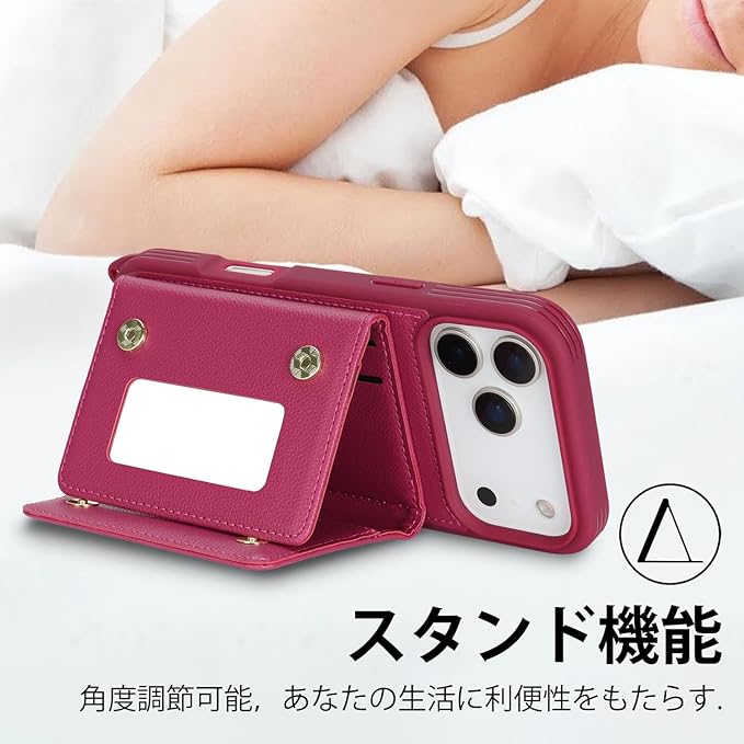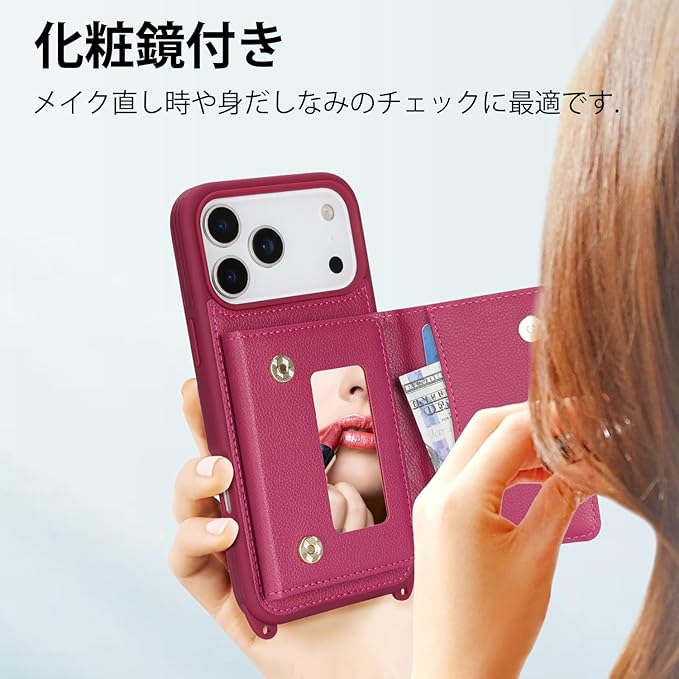 対応 iPhone 17 Pro Max ケース ショルダー いphone17 Pro Max ケース カード収納 鏡 肩掛け 斜めかけ スマホショルダー アイフォン17 Pro Max ストラップ付き 耐衝撃 調節可能な 携帯ケース - ローズレッド