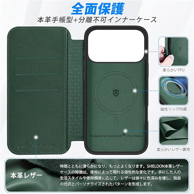 SHIELDON iPhone 17ProMax 対応 手帳型ケース 本革レザー 6.9インチ 5G 薄型 ワイヤレス充電 磁気充電可 [RFIDブロッキング] カード収納 マグネット内蔵 ストラップ穴付き 衝撃吸収 アイホン17プロマックス 対応 スマホケース 2025年発売 ミッドナイトグリーン