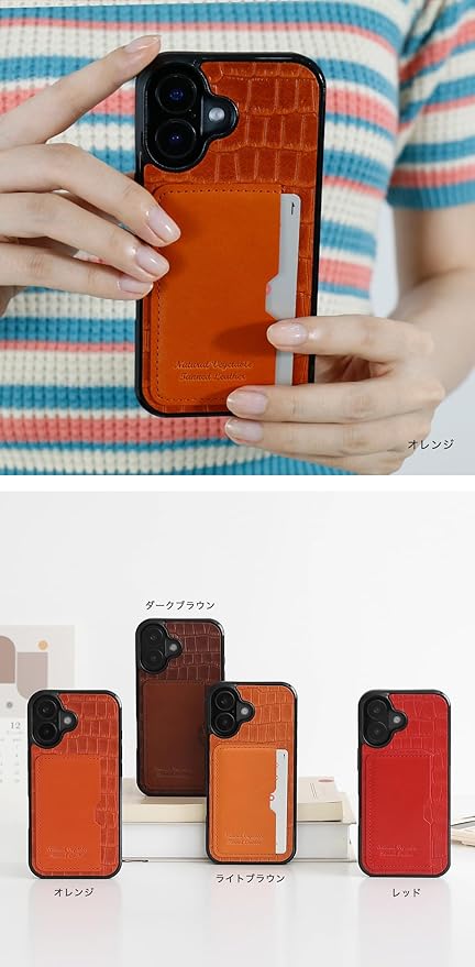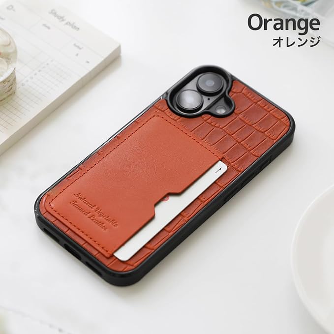 栃木レザー 本革 スマホケース iPhone 17 Pro Max 互換性 対応ケース カード入れ クロコダイル クロコ型押し グリップ 落下防止 (オレンジ)