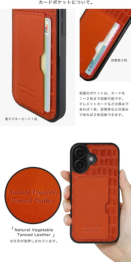 【素材】ケース背面 : 牛革 栃木レザー(牛皮を天然の植物由来のタンニンなめしを施した皮革)にクロコダイル模様をエンボス加工 カードポケット : 栃木レザー ※栃木レザーの皮革証明書「赤タグ」を同封しております。 ※仕入れる生産ロットや裁断箇所により、色合いや模様の出方が若干変わる場合がございます。「イメージと違う」など初期不良以外での返品・交換はご遠慮いただいております。予めご了承ください。 本体(内側) : PC(ポリカーボネート) 本体(側面) : TPU(熱可塑性ポリウレタン) ステッチにはドイツの手芸糸メーカー「ギッターマン(G termann)」の縫い糸を使用。