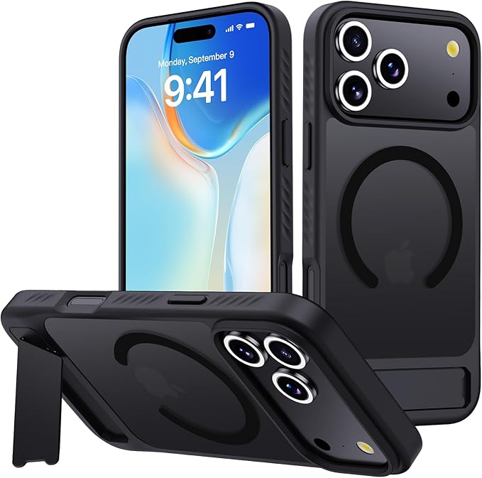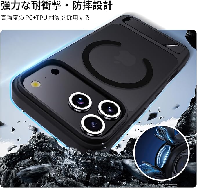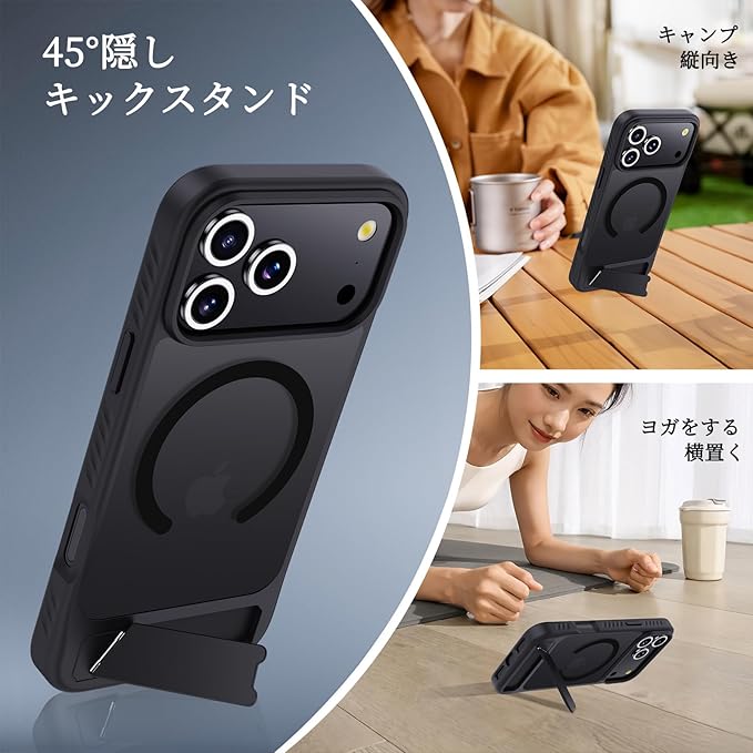 Aunote 対応 iPhone17promax ケース MagSafe対応 45 隠しキックスタンド 軍規防摔 耐衝撃 対応 いphone17promax ケース カバー 半透明のマット背面 スマホケース ブラック