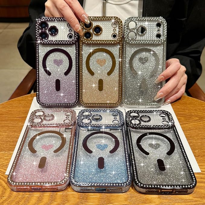 Lafunfa iPhone 17 Pro Max 用 ケース MagSafe対応 かわいい 女の子 キラキラ 透明 マグネットカバー [グリッターカード付き] ハート柄 グラデーション 光沢 ダイヤモンド 軽量衝撃吸収 [フルカメラ保護] ワイヤレス充電 アイフォン 17 Pro Max 用 スマホケース ピンク