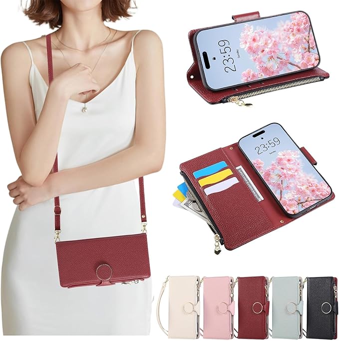 に適合するiPhone 17 Pro Max ケース 手帳型 いPhone 17 Pro Maxスマホケース 財布一体型 全面保護 ケース アイフォン17プロマックス 携帯カバー クロスボディハンギング 小銭入れ【 ストラップ 長+短 2本】アイフォン17プロマックス ケース 手帳型 スタンド機能 カード収納 ジッパー財布型カバー 手首/肩掛けストラップ付(赤)