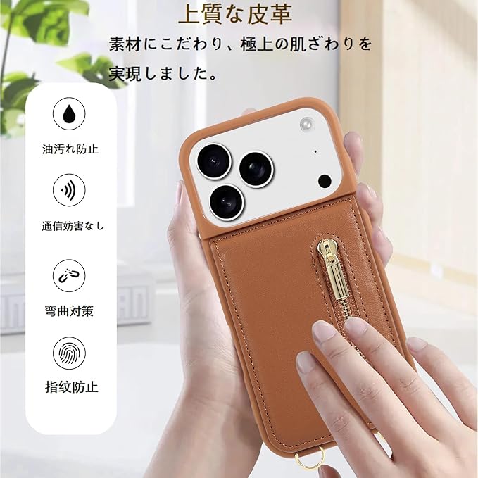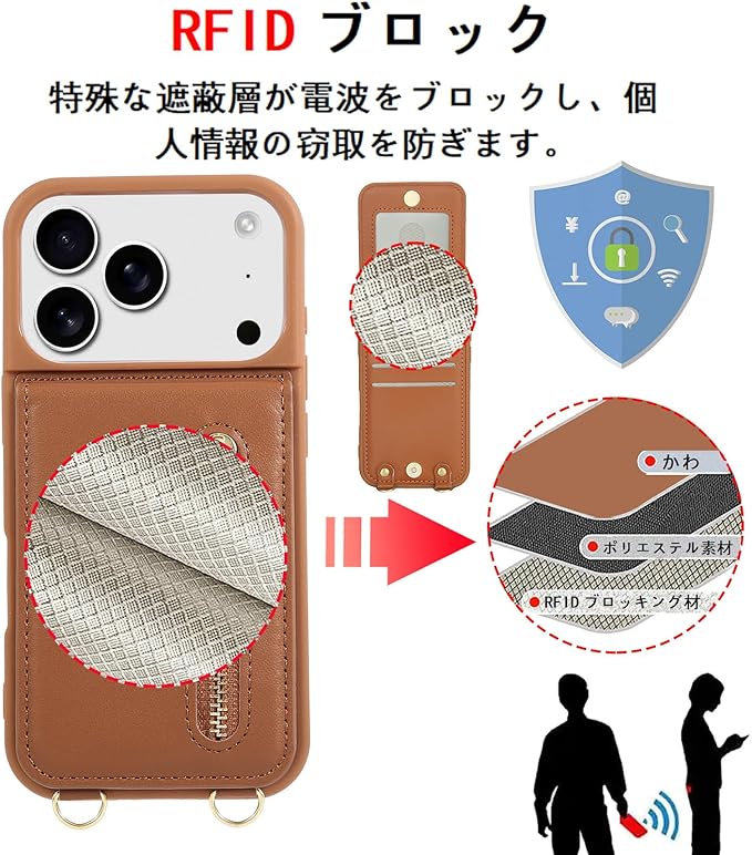 【RFIDブロッキング技術採用】本iPhone 17 Pro Maxケースはカードスロット&ポケットの裏地につける布はRFIDブロッキングライニングを採用しています。先進的なRFIDセキュア技術を利用して、信号をブロックして、ICカードの情報や個人情報などを安全に守ります。信号がブロックするから、カードをケースに入れたまま反応しない場合は、カードを取り出してご利用ください。