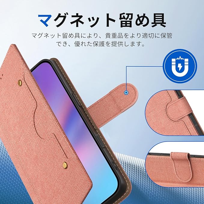 【ヴィンテージデニム風レザーケース】ケース表面には、織り模様を再現した高級PUレザーを使用し、デニムテイストを取り入れたクラシックなデザインに仕上げました。レザーの上質な質感とデニム風のカジュアルさが融合し、ファッション性と時代を超えた魅力を兼ね備えています。内側の裏地にはヴィンテージ感あふれるレザーを使用しており、全体としてレトロでおしゃれな印象を与えます。スマホを支える内部のケース部分には柔らかく弾力性のあるTPU素材を採用し、衝撃をしっかり分散・吸収。取り付け・取り外しも簡単で、スマホ本体に傷をつける心配もありません。