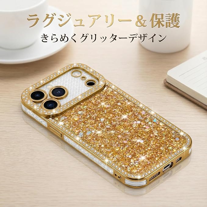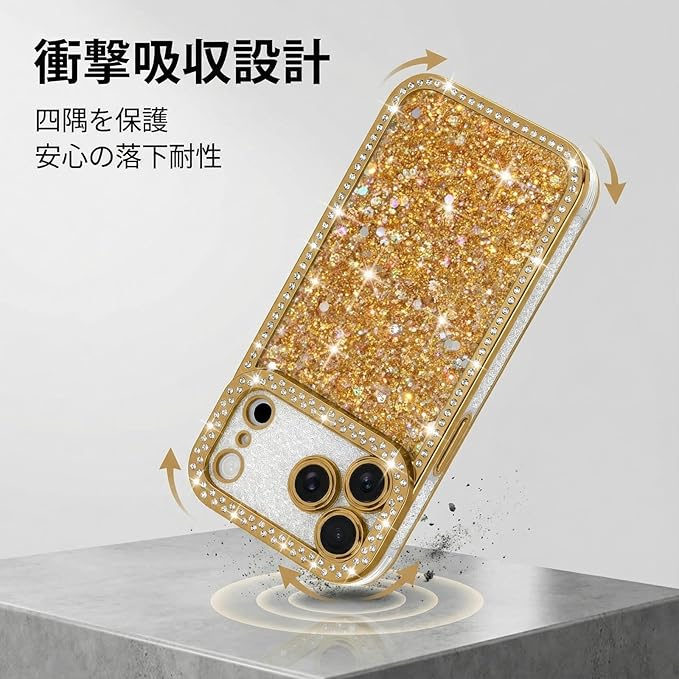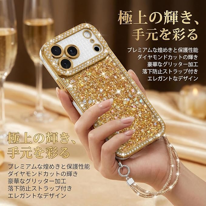 Lafunda 用の iPhone 17 Pro Maxケース キラキラ ラメ スマホケース 女の子 韓国 おしゃれ グリッター リストストラップ サラウンドレンズ保護 軽量 薄型 耐衝撃 ワイヤレス充電対応 用の アイフォン17 Pro Max カバー (ゴールド)