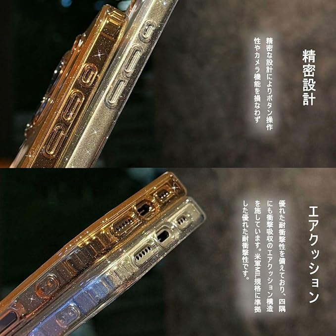 【ガラスのような透明感と輝き】、【高級感漂うキラキララメ】、【超優良TPU+ポリカーボネート、黄変しにくい】、【エアクッション+エッジ保護】