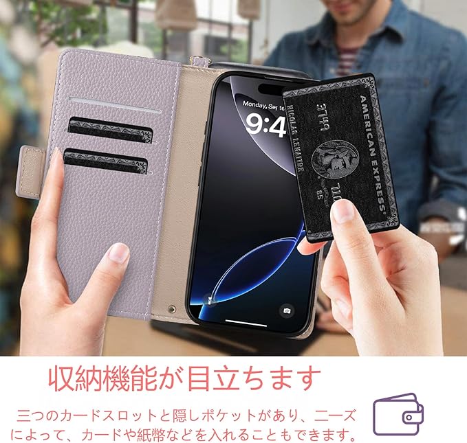 【ウォレット機能】iPhone 17 Pro Max 財布型 ケース には カード入れポケット 3、内側現金ポケット 1。がついています、ID /クレジット/デビットカード、定期券、名刺、札など収納できます。強力な磁気クロージャー、もっと安心してカードや現金を携帯のケースに入れて、安全で便利です。ショッピング、旅行、仕事、あらゆるシーンに最適です。