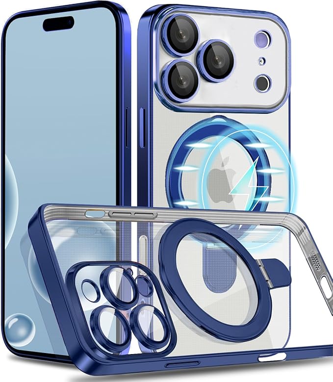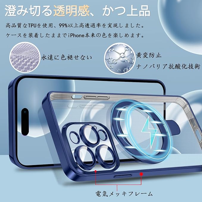 MuZiF iPhone 17 Pro Max 用 ケース MagSafe対応 リング付き クリア メッキ加工 カバー 車載ホルダー対応 多機能 レンズ保護 薄型軽量 耐衝撃構造 透明柔らかいTPU アイフォン17 プロマックス 用 磁気カバー クリアケース(ダークブルー)