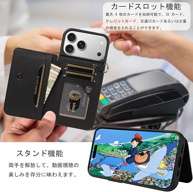 【カード収納】このiPhone 17 Pro Max ケース最大 4 枚のカードを収納可能で、ID カード、クレジットカード、交通系 IC カード、あるいは少量の現金を入れることができます。外出時に余分な財布を持ち歩く必要はありません! ショッピング、旅行、仕事、あらゆるシーンに最適です。
