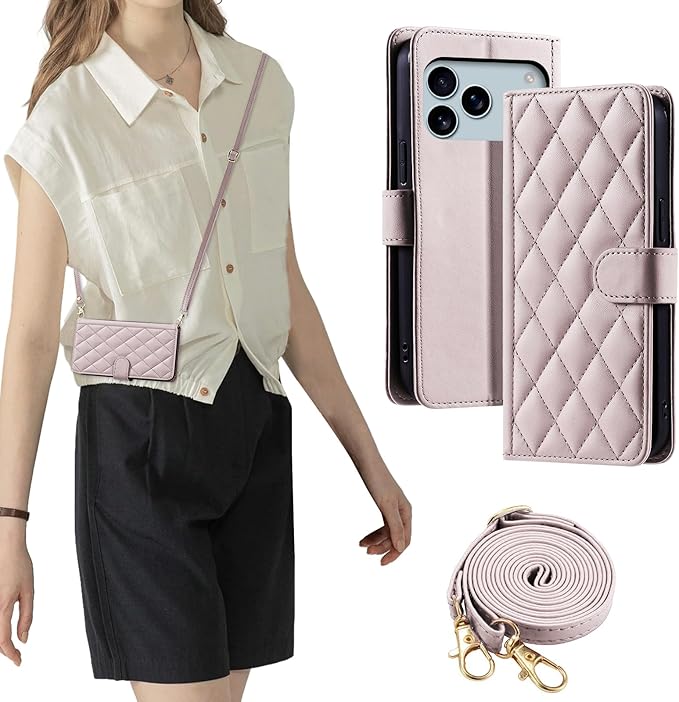 ケース 用の iphone 17 pro max ケース 防塵 おしゃれ ストラップ付き スタンド機能 カード収納 軽量 薄型 耐衝撃 高級PUレザー 滑り防止 財布型 内蔵マグネット 開閉式 チェック柄 上質 耐摩擦 マグネット式 肩掛け 斜め掛け-ピンク