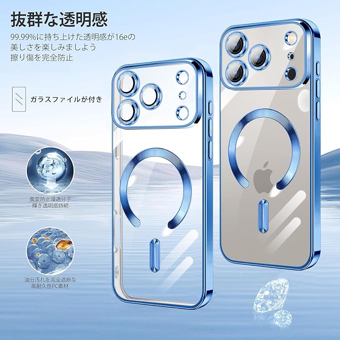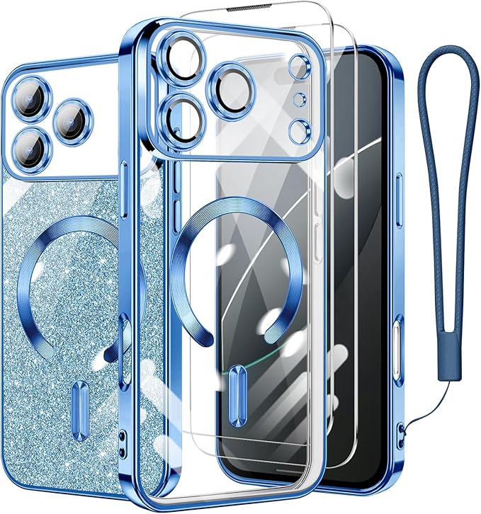 For iPhone 17 Pro Max 用 ケース クリア MagSafe対応 ワイヤレス充電 マグネット搭載 2枚 HDフィルム付き キラキラ グリッターカード ストラップ付き アイフォン 17 プロ マックス カバー マグセーフ対応 薄型 軽量 レンズ保護 全面保護 耐衝撃(ブルー)