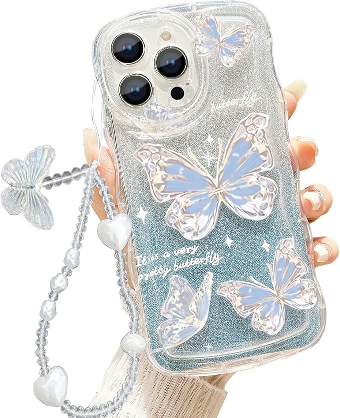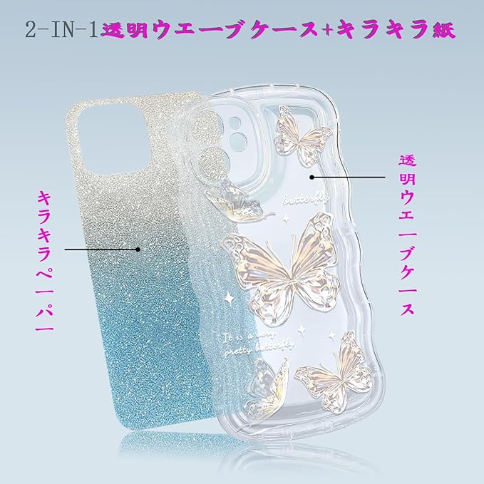 MuZiF iPhone 17 Pro Max 用 ケース クリア キラキラ 可愛い ちょう ウェーブ TPUソフト 透明 かわいい [グリッターカード&リストストラップ] 薄くて軽い スマホケース 耐衝撃 携帯カバー アイフォン 17 Pro Max用 クリアケース(ブルー)