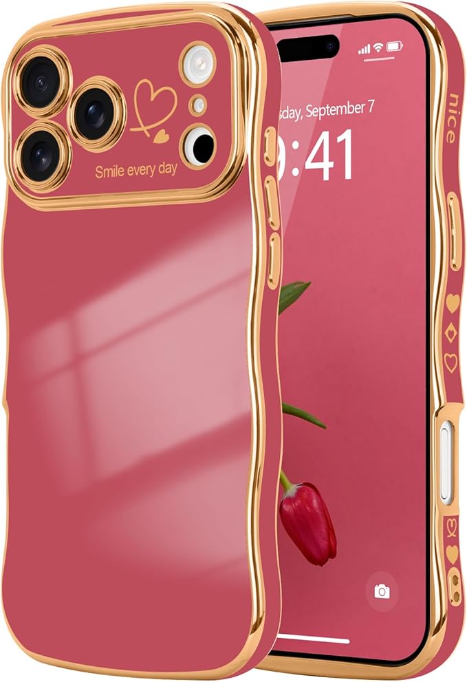 LCHULLE iPhone 17 Pro Max 用 ケース ウェーブ TPUカバー おしゃれ 滑り止め 韓国 可愛い 薄型 軽量 耐衝撃 女の子 人気 レンズを保護 ハート柄 ワイヤレス充電対応 ストラップホール付き アイフォン 17 Pro Max 用 スマホケース (カメリアレッド)