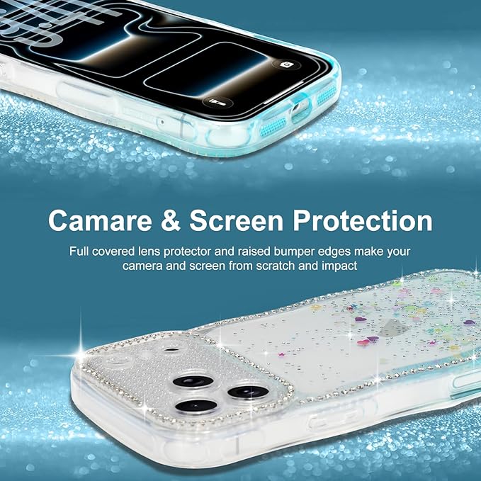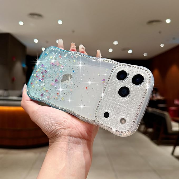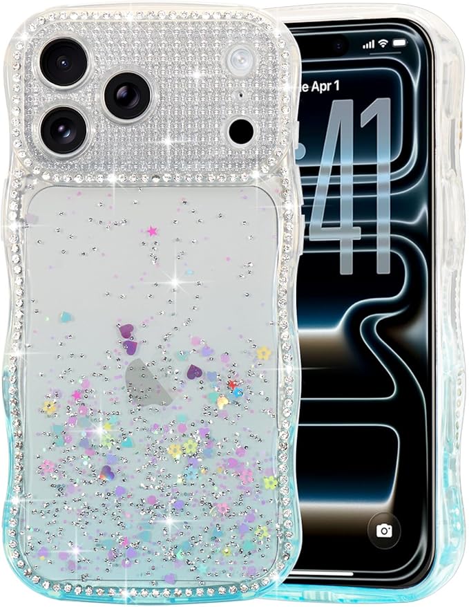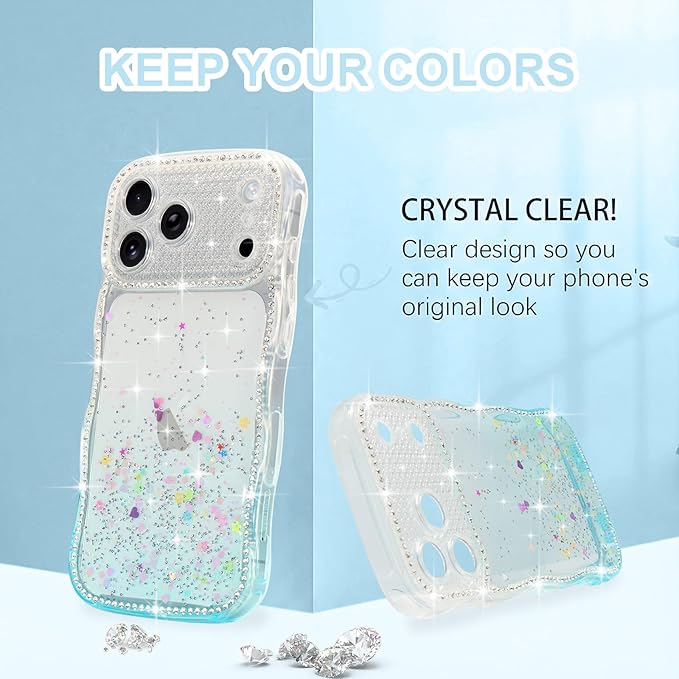 LCHULLE 用の iPhone 17 Pro Max ケース キラキラ 透明 ウェーブ ラインストーン カバー 女の子 可愛い おしゃれ 軽量 薄型 滑り止め 耐衝撃 クリア スマホケース 用の アイフォン 17 Pro Max ケース(ブルー)