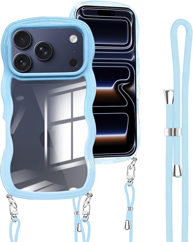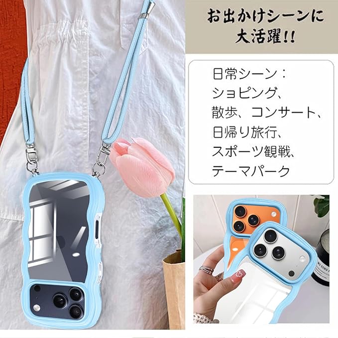iPhone 17 Pro Max 用の ケース ショルダー ストラップ iPhone 17Pro Max 用の カバー 斜めかけ 肩掛け 首掛け 韓国 クリア アイフォン17プロマックス スマホケース ライトブルー