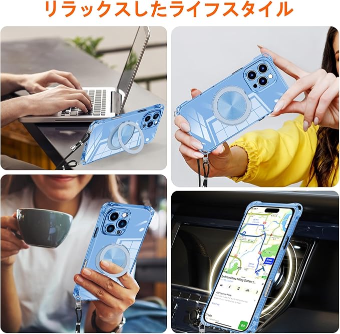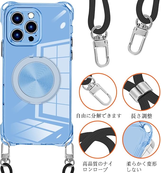 iPhone 17 Pro Max 用 ケース クリア MagSafe対応 リング スタンド 360度回転できる ワイヤレス充電 ネック ショルダー あいほん 17 pro max カバー 肩掛け 首掛け 斜めがけ 紐付き 韓国 耐衝撃 米軍MIL規格取得 スタンド機能 縦横両対応 落下防止 透明 TPU 薄型 軽量 黄変なしスタンド機能車載対応 アイフォン 17 promax スマホケース