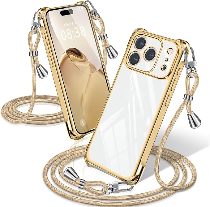 iPhone 17 Pro Max 用の ケース クリア ショルダー 耐衝撃 アイフォン17 Pro Max カバー ストラップ 透明 スマホケース 電気メッキ加工 肩がけ 首掛け 紐付き 縄掛け 斜めがけ 調節可能なショルダー TPUスマホ (ゴールド)