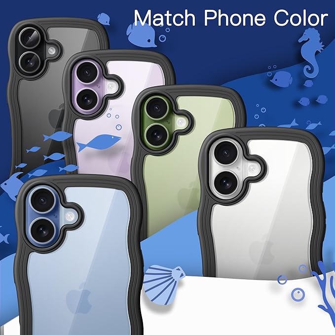 JETech iPhone 17 6.3インチ用 ウェーブ ケース かわいい 波状フレーム うねうね 耐衝撃 スマホカバー 女性用 女子向け クリア ハードPCバック (ブラック)