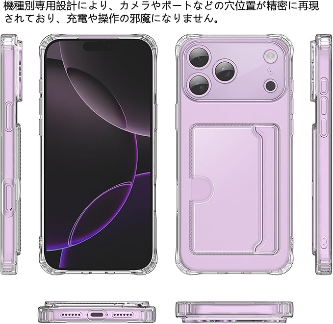 【カードスロット設計】:本体の背面側面部分に専用のカードスロットを設置。日常よく使うカード(交通系ICカード、オートロックカード、キャッシュカードなど)を1~2枚収納できます。透け感のあるクリアバックデザインで、スマホ本体の色や美しいデザインを損なわずにお楽しみいただけます。
