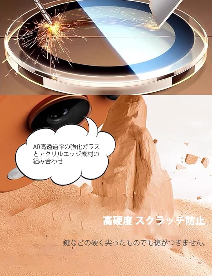 【アクリルエッジ素材 耐衝撃】:レンズ保護カバーはAR高透過率の強化ガラスとアクリルエッジ素材を採用し、鍵などの硬く尖ったものでも簡単には傷がつきません。メリットはレンズ面もレンズの周り部分も高透過率を持ちます。