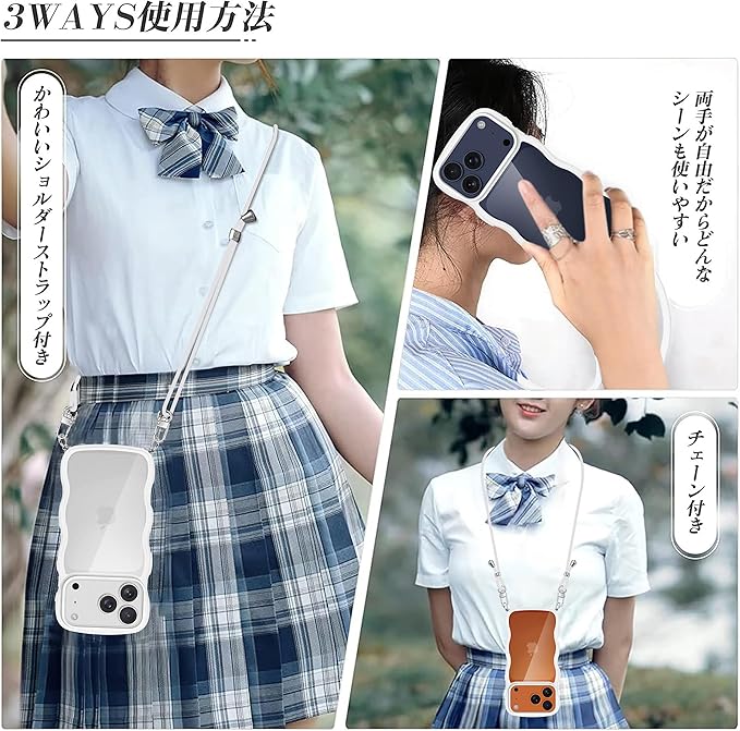 iPhone 17 Pro Max 用 ケース クリア ショルダー アイフォン 17 Pro Max 用 カバー うねうね 透明 人気 かわいい 耐衝撃 スマホケース ストラップ付き 取り外し可能 長さ調整可能 首かけ 肩掛け 薄型 軽量 TPU ワイヤレス充電対応(ホワイト)