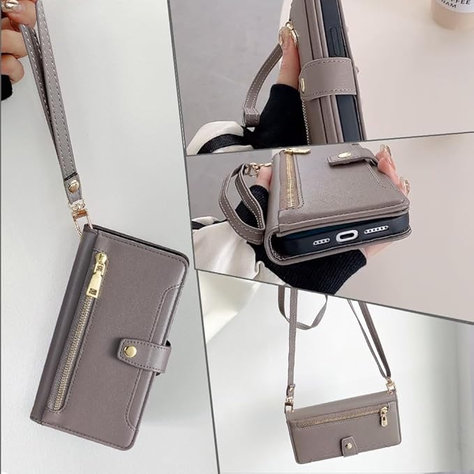 【一体型スマートフォンケース財布】 高品質PUレザー製。スマートフォンケースと多機能財布が一つに。内側にはカードホルダー 6、紙幣収納ポケット 1、ジッパー付き小物ポケット 2を完備。フラップデザインとU字型強力マグネットボタンにより、スマートフォンと貴重品の安全を確実に守ります。