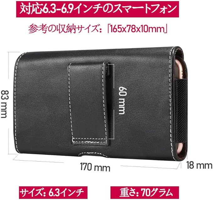 スマホケースベルト装着, 16 Pro Maxベルトホルダー 腰通し携帯電話ポーチは 黒いポリウレタン素材製造していて, 重さは75グラムです. 参考の収納サイズは「165x78x10 mm」で、6.3-6.9インチのスマホを収納できます、例えば:対応 iPhone 15 Pro max, 14 Plus, Xperia 1 VI,AQUOS R9 Pro, moto edge 40, Galaxy A55 など。 人気のスマホベルトホルダー横型携帯ホルダー.