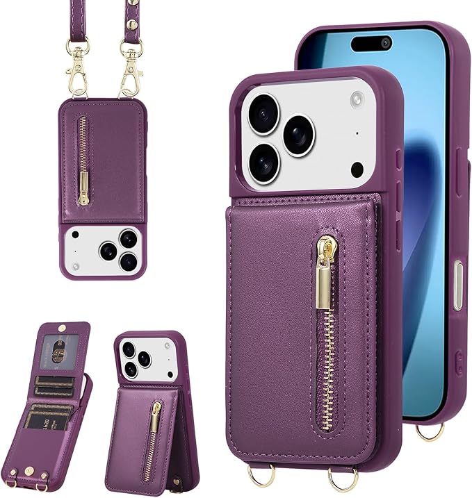 Jcxtrombulous対応 iPhone 17 Pro Max ケース 背面カード マグネットICカード収納 調節可能なストラップ付き 耐衝撃な 携帯ケース アイホン17 プロマックス スマホ PUレザー スタンド RFIDブロッキング技術ケース 6.9inchパープル