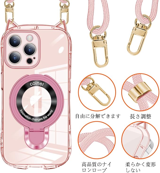【多目的キャリー & ファッションデザイン】調節可能なストラップにより、サイド、またはフロントに持ち運べるときに完璧にあなたの隣に掛けることができます。 このアクセサリーはファッションだけでなく、通常のストラップよりも快適で実用的です。 作業、旅行、出張、ショピング、散歩、コンサート、パーティーに最適です。手を離しても、携帯電話を携帯できます。 【スタンド機能】多機能スタンドとリング一体型の斬新なデザインです。隠しスタンドの設計で、省スペース性に優れ、収納するときは水平的に置けできて、持ち運びの邪魔になりません。縦置きでも横置きでも安定して支えられ、40 ~120 の間で多角度自由に調整できます。FaceTimeでも動画でも両手が完全に解放されます。また、安定したアルミ合金製の円形スタンドを採用しており、携帯性からもファッション性からも唯一無二の存在です。【簡単着脱・美しさを保つ】猫耳部分にストラップ穴が設けられているのでストラップを簡単に取り付けたり取り外したりでき個人の好みに合わせて装着することができます。猫耳のデザインはストラップを取り外しても可愛らしさが損なわれず一体感のあるデザインで美しさを保ち続けます。【 360 全面保护】、各穴に誤差がなく、すべての機能はケースをつけたままスムーズに操作できます。ケースは、型どりを緻密に実施しておりレーム部分とカメラのフチをちょうどいい設計し。平らな場所においても、画面とカメラレンズに直接触れることがなくまたケースの四隅に落下時の衝撃を効率よく吸収するための技術落下時の衝撃を最小限に抑えます。 【フレキシブル&柔軟】 このTPU+PC ケースは、ネックバンドの電話ケースは高品質のンで作られ、透擦り傷防止 柔らかい手触り滑り止め 黄変防止衝突や引っかき傷から電話を保護できます 調節可能なショルダークロスボディネックレス このアクセサリーはファッションだけでなく、通常のストラップよりも快適で実用的です。