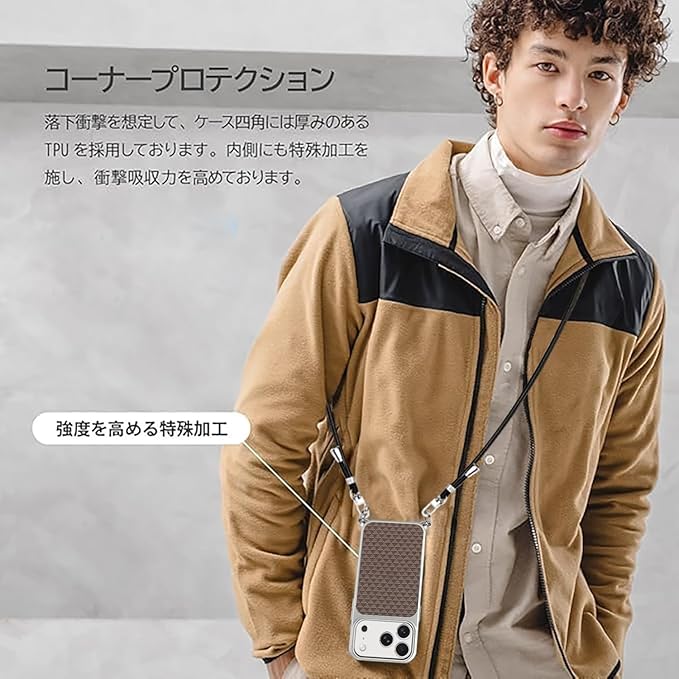 【iPhone17ProMax 高フィット性 スマホケース】iPhone17ProMax 専用に設計されたフィット性の高いスマホケースで、充電ポート、操作ボタン、スピーカーの各カットアウト位置が高精度で合致します。ケース装着時も充電作業、ボタン操作、音声出力がスムーズに行え、機器をしっかり固定しながらも使い勝手を最大限に保つ実用的なスマホケースです。【iPhone17ProMax ストラップ付き 多用途 スマホケース】本製品は iPhone17ProMax 専用の携帯便利なスマホケースで、腕掛けバンドと首掛けストラップをセットで付属しており、ストラップ長さを自由に調整可能な設計となっています。体の横側や胸前に自然に掛けて固定できるため、手を離した状態でもスマホを安定して携帯でき、両手を解放して他の作業を進めることができる実用的なスマホケースです。付属のストラップはおしゃれなデザインで、一般的なストラップに比べて装着時の接触面が柔らかく、長時間使用しても違和感が少ないという特徴を備えています。日常の仕事場での使用、レジャー旅行、ビジネス出張、買い物時の携帯、散歩中の持ち運び、コンサートやパーティーでの活用など。