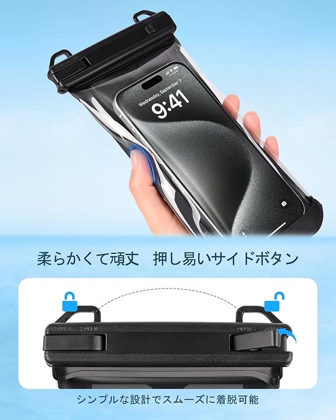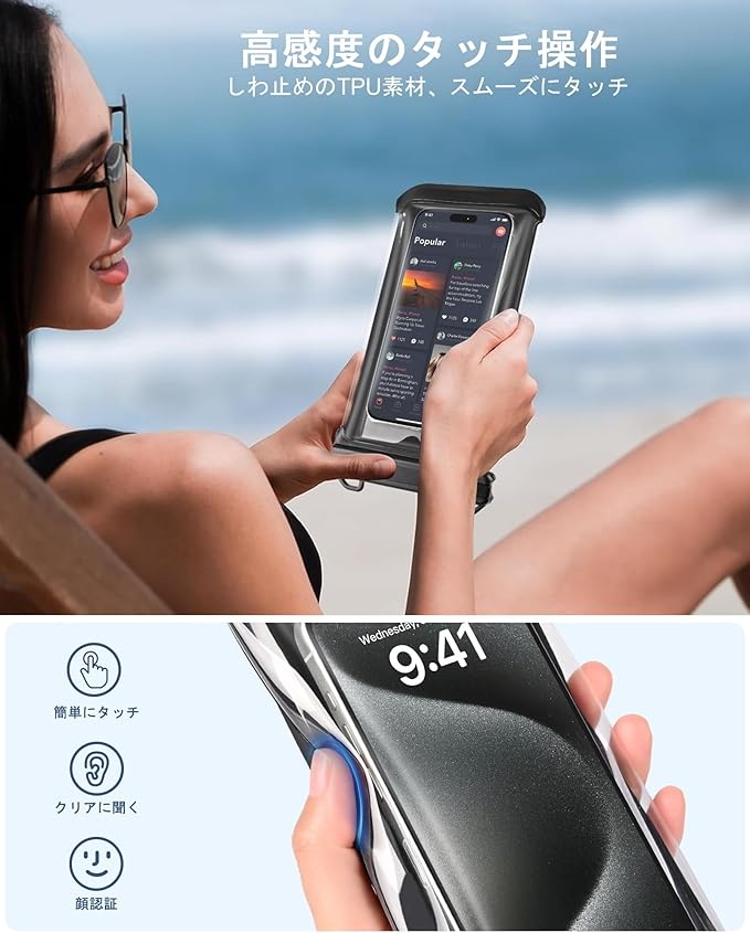「水中撮影・透明設計」このスマホ防水ケース完全防水の表面は高透光で、光の透過率は99.99%を超え、顔認証も一瞬で完了。また、両側に3D透明化されており、例え水中でも簡単にスマホのサイドボタンを押せます。水中撮影にぴったりです。更に、防滴デザインのため水滴が残ったり,曇ったりはしません。いつでもクリアな画面で気楽に水中撮影ができます。その他、タッチ操作や電話応対などの操作もスームズにできます。★ご注意❗❗★タッチ反応しない場合、プールスマホ防水ケースの表面を綺麗にしてもっと力を入れてタッチしてください。★水圧の影響で水中撮影の際に、ボリュームボタンの使用はお勧めです。