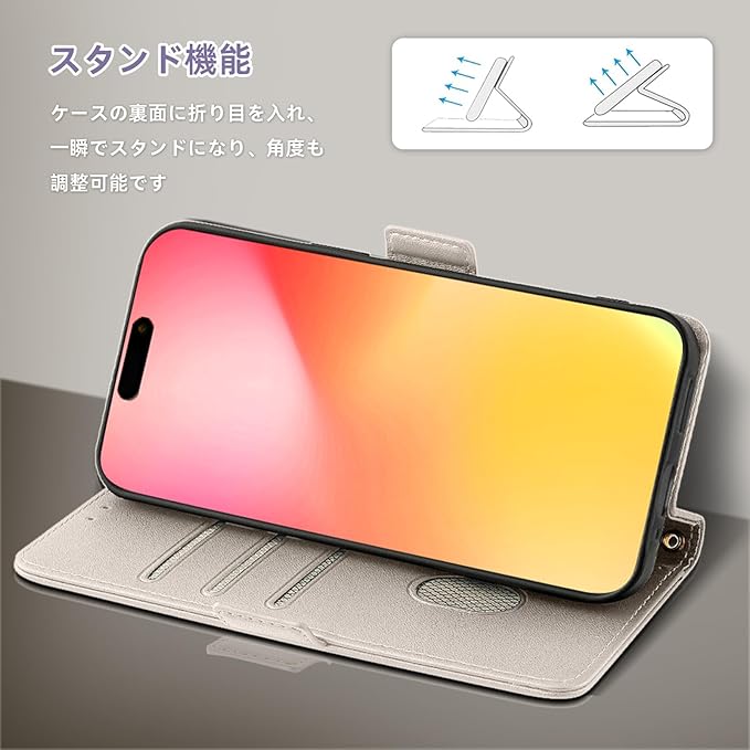【カード収納】 カードポケットと隠しポケット付きなので、カード、レシート、定期券、名刺などの収納にも優れます。ちなみに、磁気バックルが使えるように、カードを多すぎ入れることをご遠慮ください。[注意:無接触なプライバシー盗難から個人情報を防衛するために、カード入れの内側にRFID自動遮断の素材を採用します。それで、カードをいれたままの読み取りはできません。ご理解をお願いいたします。]※【スタンド機能】 ケースの裏面に折り目を入れ、一瞬でスタンドになります。手に持たず動画の視聴などを楽しむことができます。角度も調整可能です。