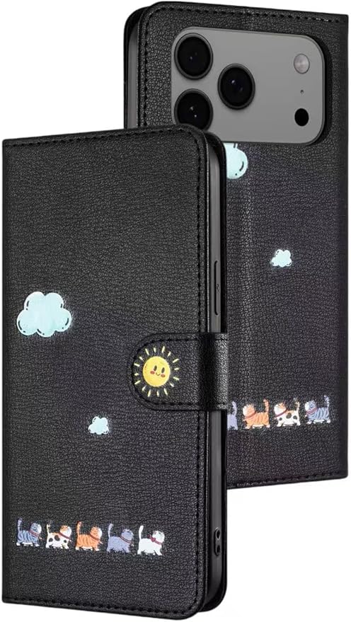 適用の iPhone 17 Promaxケース 手帳型 いphone17Promax 手帳ケース 財布型 シンプルなのに可愛いデザイン ストラップ付き エンボス加工猫柄 うれしい気持ち スタンド機能&カード収納付き iPhone 17Promax用スマホケース 薄型 防水 の耐久性 滑り防止 可愛い 贈り物 (iphone 17 ProMax,ブラック)