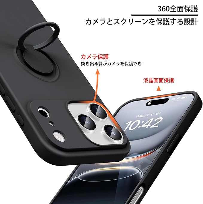 iPhone 17 Pro Max 対応 ケース TPU 耐衝撃 リング シリコンケース 薄型 ソフト 全面保護カバー 指紋防止 リング付き スタンド機能 車載ホルダー対応 360 回転 レンズ保護 ストラップホール付き スリム 軽量 黄変防止 防塵 アイフォン 17プロ マックス対応カバー [黒] KC6-410