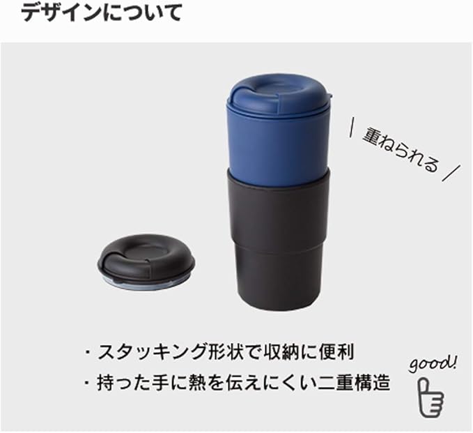 持ったときに熱くならないのも良い。使い終わったら分解して洗えるので衛生的なのもgood。スタッキング。重ねて収納できるタイプ。