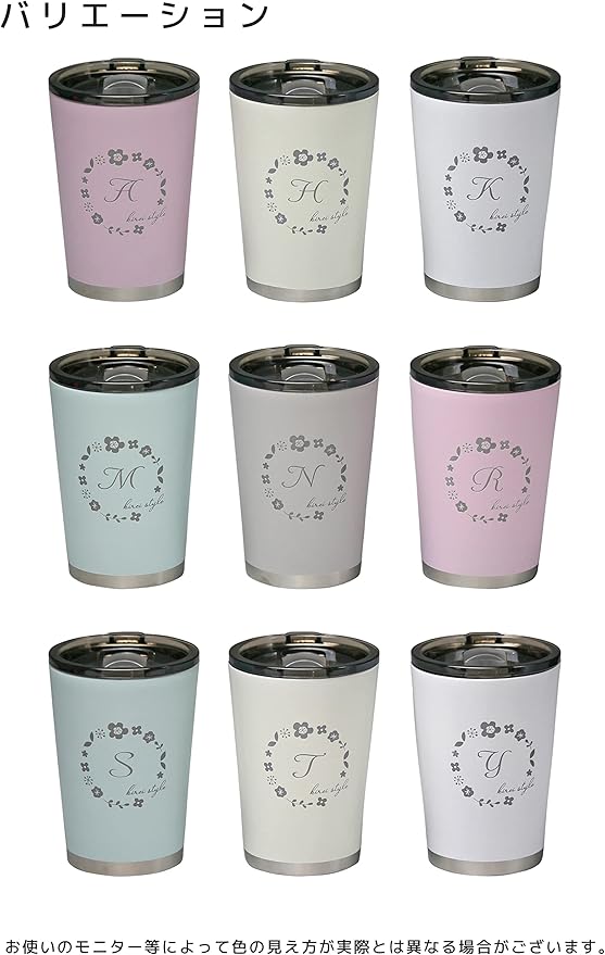 ★花枠がかわいい北欧テイストのイニシャルステンレスタンブラー! ■商品サイズ:約φ8.7 h12.6cm(フタ装着時)/重量約172g ■容量:約450ml(満水)/約350ml(フタ装着時) ■材質:本体=ステンレス鋼 ■生産国:生地=中国、絵付加工=日本 ●真空断熱二重構造で美味しい温度が長持ち! ●結露しないから安心して使えます。 ●内側は錆びにくく耐久性に優れた18-8ステンレス素材を採用。 ●コンビニコーヒーをそのままカップごと入れるだけ!おいしい温度をキープ! ●車内でも使えるからドライブにもおすすめです。 ●フタ付きだからほこりなども防いで衛生的。 ●フタはスライド式でストローにも対応しています。 ●パーツを取り外して洗える簡単構造のフタでお手入れも楽々。 ●自宅での日常使い、家呑みなど様々なシーンで活躍してくれます。