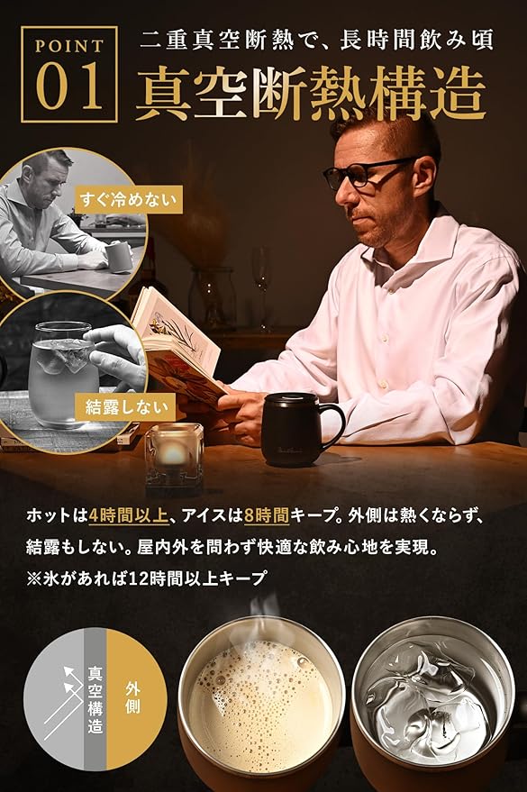 【二重壁真空断熱で長時間おいしい】内外層とも食品グレード304 ステンレスを採用した二重壁真空断熱構造が、氷の入ったアイスコーヒーを最大6時間キリッと保冷し、ホットラテも3時間以上しっかり保温。外側は熱くならず結露もしないのでデスクや車内を汚しません。朝淹れたブラックコーヒー、午後の水出しティー、仕事終わりのビールまで味わいをキープできる実力派マグです。電気を使わないエコな温度管理でサステナブルなライフスタイルをサポート。たっぷり320ml容量だからカプチーノのフォームを崩さず注げ、夜はスープマグとしても活躍。季節を問わず一年中使える万能 コーヒーカップ/コップで、SaintGraalブランドの技術が日常の一杯を格上げします。