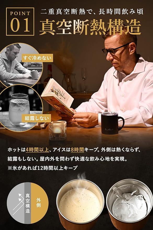 【長時間保温・保冷を実現する真空断熱構造】重壁真空断熱構造が、氷の入ったアイスコーヒーを最大6時間キリッと保冷し、ホットラテも3時間以上しっかり保温。熱いブラックコーヒーも冷たいアイスラテも飲み頃温度をキープし、オフィスでも屋外でも活躍します。外側が熱くならず結露もなし。ハンドドリップの香りやスポーツドリンクの冷たさを逃さず、キャンプや夜釣りなど多彩なシーンで“いつでも飲み頃”を提供。蓋付きで、シリコン製Oリングが隙間をふさぎ、移動中の揺れでもこぼれにくい安心構造です(密閉容器ではありません)