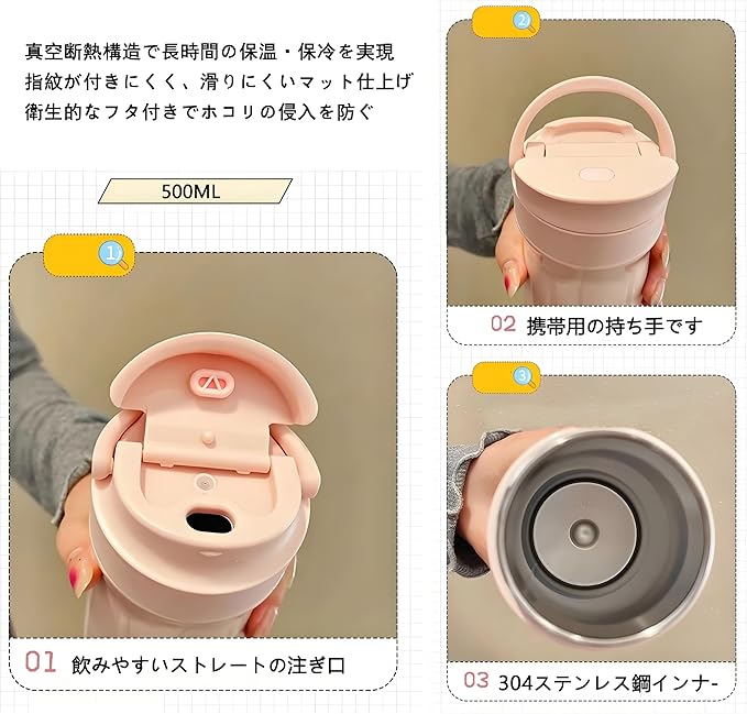 水筒 500ml タンブラー 蓋付き こぼれない ステンレスタンブラー 真空断熱 コーヒー 大容量 魔法瓶 おしゃれ 長時間 保冷ボトル 持ち運び コンビニコーヒー t 取っ手付き 車 ドリンクホルダー対応 可愛い 真空 coffee mug カフェオレ入れられる水筒 漏れない 断熱 保冷保温 車用