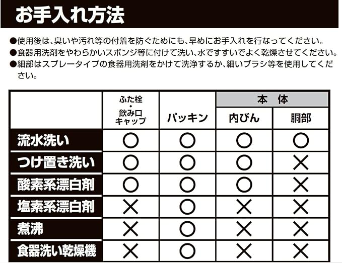 品名:ステンレス製携帯用まほうびん、実容量:0.3L、保温効力:36度以上(6時間)、保冷効力:15度以下(6時間)、素材・材質:内びん/ステンレス鋼、胴部/ステンレス鋼(アクリル樹脂塗装)、ふた栓/ポリプロピレン(発泡スチロール内蔵)(耐熱温度100度・耐冷温度-20度)、飲み口キャップ/ポリプロピレン(耐熱温度100度・耐冷温度-20度)、ハンドル/TPE(耐熱温度70度・耐冷温度-20度)、パッキン/シリコーンゴム(耐熱温度180度・耐冷温度-20度)
