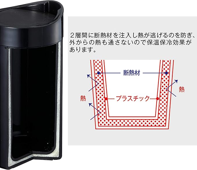 プラスチックで軽量。2層構造でさらに中空層には断熱材が入っており、保温効果は抜群。